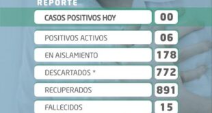 Hoy no se reportan casos. 6 son los positivos activos en total, debido a que 5 persona se ha recuperado y recibió el alta. Además, contamos con 178 personas en aislamiento por prevención. . Total de casos hasta la fecha: 839. Total de dosis aplicadas hasta la fecha: 5096. ANGÉLICA …