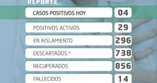 INFORME EPIDEMIOLÓGICO Nº 288: 7 de julio 2021 Informamos 4 nuevos casos positivos, los cuales hoy suman 29 positivos activos en total, debido a que 3 personas se han recuperado y recibieron el alta. Además, contamos con 296 personas en aislamiento por prevención y 8 casos fueron descartados. . Total …