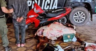 Efectivos rurales a raíz de un llamado telefónico, por parte de un productor agropecuario de 73 años de edad, se hacen presentes en el lugar donde, procedieron a identificar a dos masculinos faenando un animal vacuno aproximadamente 250 Kilogramos, ante la presencia del personal policial, un sujeto se da a la fuga, mientras logran aprehender al …