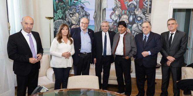 El presidente Alberto Fernández mantuvo este martes un almuerzo de trabajo en Casa Rosada con el ex mandatario de Bolivia, Evo Morales, en el marco del Día de la Confraternidad Argentino Boliviana, en conmemoración del nacimiento de la generala Juana Azurduy.