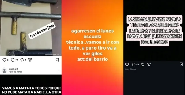 Uno de los mensajes viralizados señalaba: “La semana que viene vamos a tirotear las secundarias técnicas y brotécnicas de Rafaela”, mientras que otra publicación mencionaba: “Agarresen el lunes escuela técnica… vamos a ir con todo, a puro tiro”.