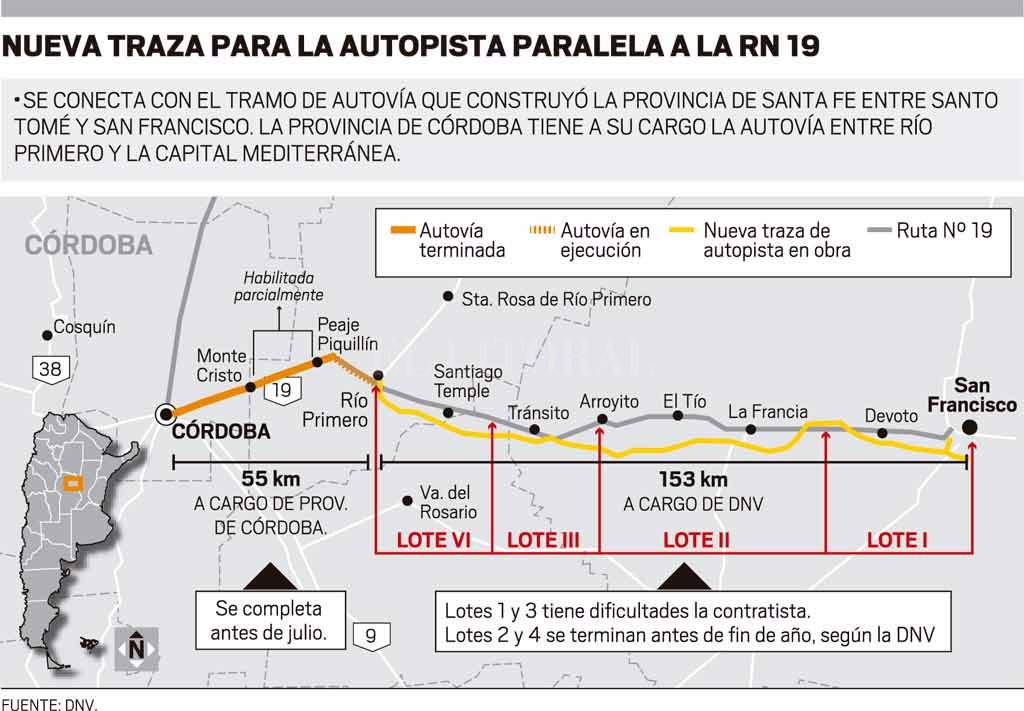 Así como lo hizo Obeid en Santa Fe, durante el kirchnerismo, para tener doble calzada entre la capital provincial y San Francisco, también los cordobeses se hicieron cargo desde su provincia de un tramo de la Ruta Nacional 19. La hicieron autovía en 2014 entre la circunvalación de la capital mediterránea y Monte Cristo; pero tienen jurisdicción -y están en obra- desde allí hasta Río Primero, donde “empalmarán” con la obra de la DNV.