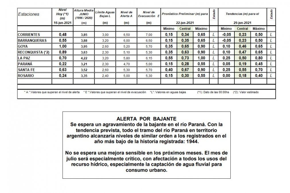 En la última proyección de los técnicos del Sistema de Alerta Hidrológico de la Cuenca del Plata (del INA), que se publicó este miércoles 16 de junio, se advierte que se espera un agravamiento de la bajante en el río Paraná y con el verbo en potencial se agrega que “el tramo del río Paraná en territorio argentino alcanzaría niveles de similar orden a los registrados en el año más bajo de la historia registrada: 1944”.