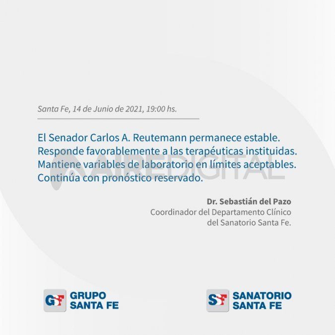 El reporte que lleva la firma del médico Sebastián Del Pazo, coordinador del Departamento Clínico del Sanatorio Santa Fe, indicó que el exgobernador «responde favorablemente a las terapéuticas instituidas» y «mantiene variables de laboratorio en límites aceptables».