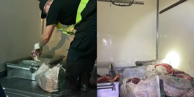 En presencia de testigos, los agentes realizaron una requisa y confirmaron el transporte de alrededor de 360 kilos de carne vacuna distribuidos en siete bolsas de arpillera plástica. La carga no contaba con condiciones sanitarias adecuadas ni con la documentación exigida para su traslado.