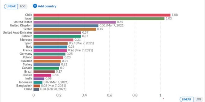 El país trasandino lidera no sólo el ranking sudamericano sino también los primeros puestos del listado mundial en cuanto al ritmo de su vacunación. A la cabeza se ubica Israel, con el 59% de su población inoculada con al menos una dosis; le sigue Reino Unido con 34% y luego Chile con el 26%. En cuarto lugar se posiciona Estados Unidos, con 19%. En una lista de 50 países, Argentina se ubica recién en la posición 44, con el 4% que recibió la primera aplicación.