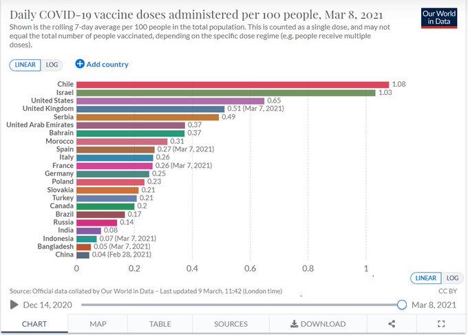 El país trasandino lidera no sólo el ranking sudamericano sino también los primeros puestos del listado mundial en cuanto al ritmo de su vacunación. A la cabeza se ubica Israel, con el 59% de su población inoculada con al menos una dosis; le sigue Reino Unido con 34% y luego Chile con el 26%. En cuarto lugar se posiciona Estados Unidos, con 19%. En una lista de 50 países, Argentina se ubica recién en la posición 44, con el 4% que recibió la primera aplicación.