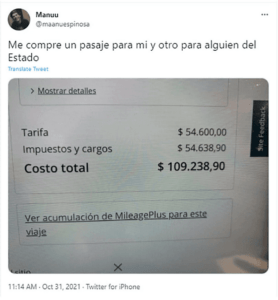«Me compré un pasaje para mí y otro para alguien del Estado», escribió Manuel Espinosa en la red social, haciendo referencia a los altos costos por «impuestos y cargos» que figuran en la captura del resumen de su compra.