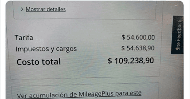 En la imagen se puede observar que este usuario compró un boleto por $54.600 pesos, a lo que se le sumaron unos $54.638,90 más en impuestos y cargos, dando un total de $109.238,90 pesos argentinos.