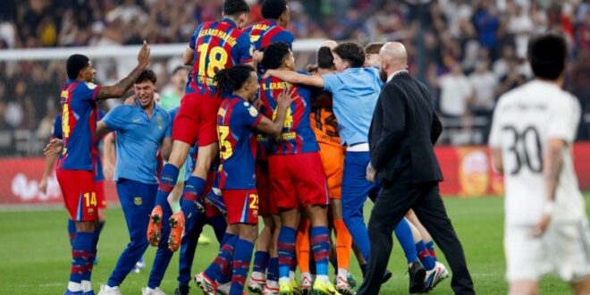 Un doblete del brasileño Raphinha le dio la victoria al Barcelona frente al Real Madrid por 3-2 en la final de la Supercopa de España y le permitió al conjunto catalán levantar su decimosexto título en el certamen, consolidándose como el máximo ganador de la competencia. Además, significó el cuarto trofeo bajo la conducción de Hansi Flick.