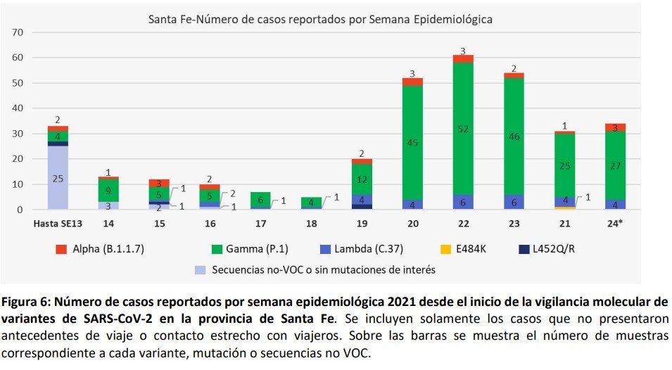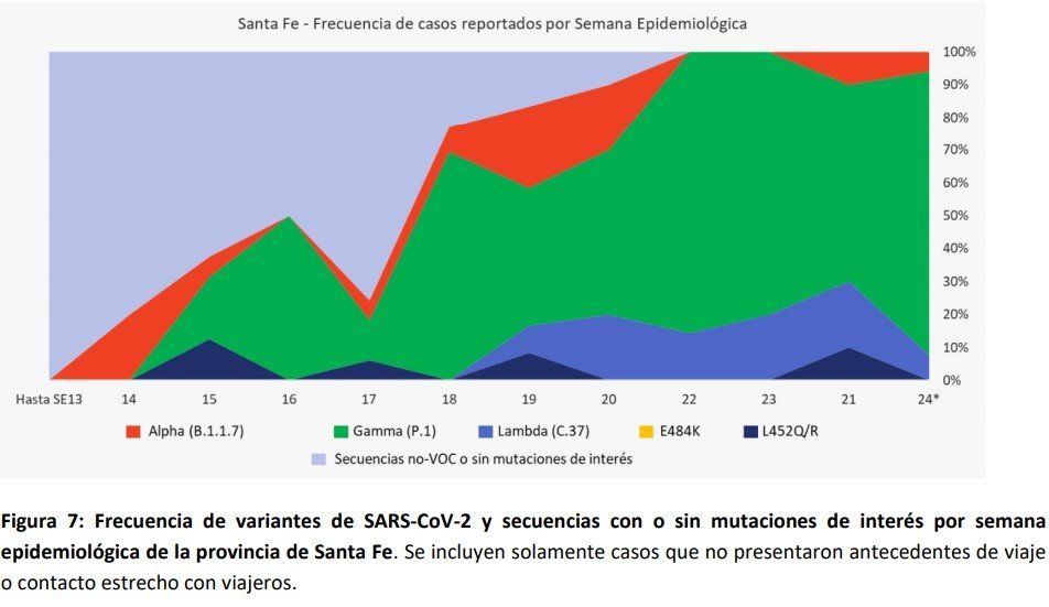 A nivel país, la principal variante encontrada en las últimas semanas epidemiológicas es Gamma (Manaos), seguida por Lambda (Andina) y en menor medida, Alpha (Reino Unido); Zeta (Río de Janeiro) y Epsilon California), de forma esporádica. Hasta el momento, no se detectó la combinación de mutaciones característica de la variante Beta (linaje B.1.351, Sudáfrica), ni de la variante Delta (linaje B.1.617.2, India) en casos sin nexo epidemiológico con viajeros al exterior. Además de las muestras provenientes de la provincia de Santa Fe, se analizaron casos de Caba, provincia de Buenos Aires, Chaco, Córdoba, La Pampa y Neuquén. En total, fueron 965 las muestas secuenciadas.