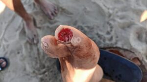 El hombre mayor de edad, presentó heridas profundas en sus dedos gordo y menique de uno de sus pies, mientras que el menor de edad terminó con heridas en uno de sus talones.