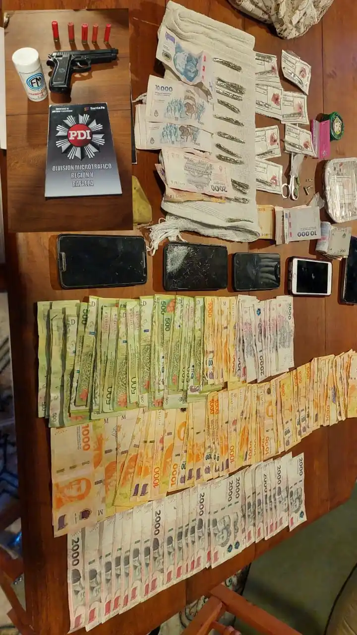 Como resultado del allanamiento en la vivienda de calle Lavalle al 200, los investigadores secuestraron 14 cigarrillos de armado casero con un peso total aproximado de 4,3 gramos, dos teléfonos celulares, una réplica de arma calibre 9 milímetros, un recipiente con balines, $316.630 en efectivo y cinco cartuchos de escopeta (tres calibre 16 y dos calibre 18).