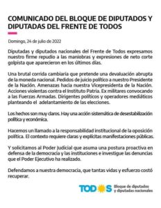 En ese aspecto, enumeraron una «brutal corrida cambiaria que pretende una devaluación abrupta de la moneda nacional; pedidos de juicio político a nuestro Presidente de la Nación (Alberto Fernández) y amenazas hacia nuestra vicepresidenta (Cristina Fernández)».