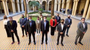 Máximo Kirchner, Massa y De Pedro llegaron a Balcarce 50 cerca de las 16, varios minutos después del arribo del gobernador de la provincia de Buenos Aires, Axel Kicillof. Los cuatro se tomaron una foto en el Patio de las Palmeras junto al resto de los invitados al acto: Ritondo; Jorge Macri, la secretaria de Provincias, Silvina Batakis; el secretario de Municipios, Avelino Zurro; el secretario de Gestión Administrativa del Ministerio de Obras Públicas, Guillermo Sauro; la intendenta de Cañuelas, Marisa Fassi; la intendenta de General Arenales Erica Revilla; la intendenta de Quilmes, Mayra Mendoza; y el intendente de Lomas de Zamora, Martín Insaurralde.
