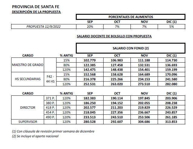 La propuesta salarial del gobierno, (cuyas características centrales pueden apreciarse en el cuadro adjunto, donde se explicita además la cláusula de revisión en diciembre y se incluye el aporte nacional Fonid) fue rechazada por Amsafé. Esos fueron los números ofrecidos por el gobierno provincial, y sujetos a nueva discusión en la mesa paritaria de diciembre.