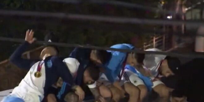 Lionel Messi, Ángel Di María, Rodrigo De Paul, Leandro Paredes y Nicolás Otamendi se sentaron en la parte más alta del micro descapotable. En un instante, el vehículo aceleró la marcha, dobló y los jugadores, que venían distraídos en ese ambiente de celebración, se encontraron de frente con un grueso cable, que por fortuna no llevaba corriente eléctrica de alta tensión.