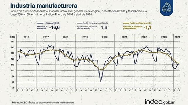 En el caso del índice de producción industrial manufacturero que mide el organismo oficial, la industria registró una caída de 16,6% interanual en abril, y una recuperación de apenas 1,8% en relación con marzo de este año.