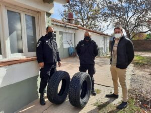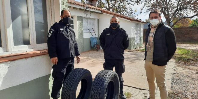El vicepresidente comunal, Miguel Roatta; y el secretario de gobierno, Alejandro Fink, hicieron entrega de dos cubiertas nuevas para uno de los móviles policiales de la Comisaría 5ta San Vicente, con el objetivo de velar por la seguridad y bienestar de la ciudadanía de la mejor manera.