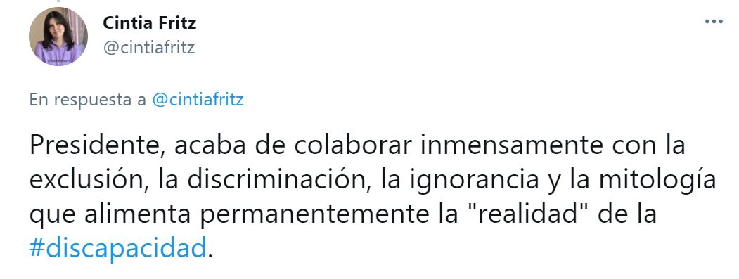 “Me alarma que ninguna de las personas que lo rodea y tiene la función de asesorarlo no le haya explicado que nada de lo que dijo colaboró con la construcción social de la inclusión, la comprensión e integración de la diversidad y la realidad de la discapacidad”, agregó“Usted le acaba de decir a todo el país que la discapacidad es una capacidad diferente. Que con ‘esos chicos’ no se puede, y permítame una confesión: hasta parece insinuar que fueran personas a las que no hay nada que los haga entender ciertas cosas”, cuestionó.