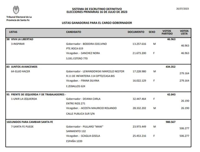 Este miércoles terminó el escrutinio definitivo, el único que tiene validez jurídica, de las elecciones primarias, simultáneas y obligatorias (Paso). Los departamentos Rosario y San Lorenzo eran los últimos que quedaban pendientes. El Tribunal Electoral de Santa Fe confirmó que habrá sólo cuatro listas de candidatos a la gobernación y seis en la categoría diputados.