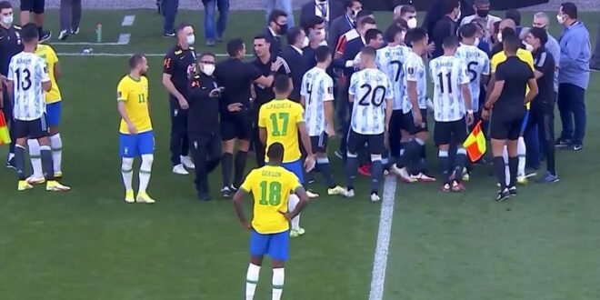 En el informe del árbitro venezolano Jesús Valenzuela al que tuvo acceso Infobae el mismo día del partido que fue suspendido a los cinco minutos luego del acceso de personal de seguridad tras la denuncia a los mencionados cuatro futbolistas albicelestes por violar la normativa federal de ingreso al país, se estableció que “se hicieron presentes personal de vigilancia sanitaria del estado comunicando que el encuentro no podría seguir por haber jugadores (Emiliano Martínez, Giovani Lo Celso, Cristian Romero y Emiliano Buendía) que no habían hecho la cuarentena, según la legislación del estado de San Pablo. Procediendo a la suspensión del encuentro”.