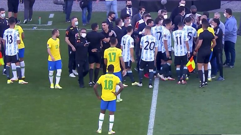 En el informe del árbitro venezolano Jesús Valenzuela al que tuvo acceso Infobae el mismo día del partido que fue suspendido a los cinco minutos luego del acceso de personal de seguridad tras la denuncia a los mencionados cuatro futbolistas albicelestes por violar la normativa federal de ingreso al país, se estableció que “se hicieron presentes personal de vigilancia sanitaria del estado comunicando que el encuentro no podría seguir por haber jugadores (Emiliano Martínez, Giovani Lo Celso, Cristian Romero y Emiliano Buendía) que no habían hecho la cuarentena, según la legislación del estado de San Pablo. Procediendo a la suspensión del encuentro”.