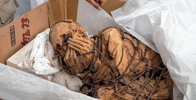 Arqueólogos peruanos hallaron una momia preinca de entre 1.200 a 800 años de antigüedad atada sorprendentemente con soguillas, mientras excavaban en un milenario complejo urbano de barro en la periferia de Lima, Perú.
