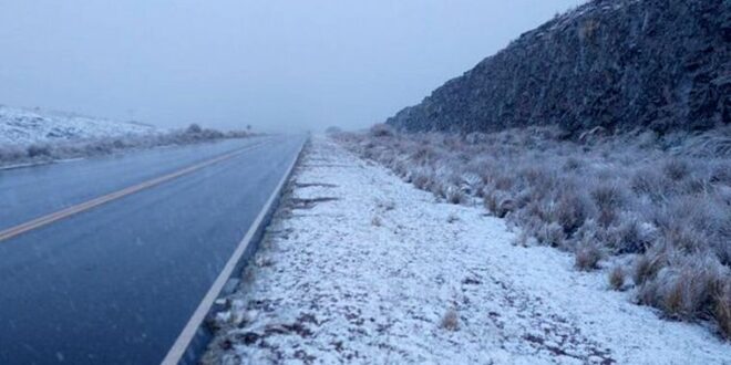 La Policía Caminera informó: «Se registra caída de nieve copiosamente desde el km. 40 al 45 de la ruta E-34. Visibilidad reducida por niebla y lluvia».