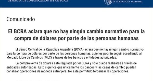 En medio de la confusión, el Banco Central aclaró que la decisión que tomó ese banco no se debe a ninguna restricción nueva. «La compra-venta de dólares está regulada por el Banco Central de la República Argentina y sólo puede realizarse a través de entidades autorizadas», explicaron fuentes del organismo. «Esto significa que únicamente los bancos y las casas de cambio habilitadas pueden canalizar operaciones de compra–venta de moneda extranjera. No está permitido tercerizar las operaciones. Los Alyc pueden vender dólares ccl/mep sin restricciones».