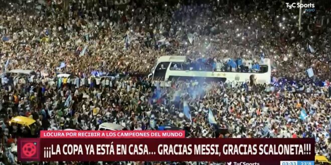 Con la Selección ya en Argentina, los hinchas continúan en las calles y se preparan para una caravana histórica. Según pudo saber TN, el micro de los jugadores partirá este martes desde Ezeiza al mediodía, tomará la Autopista Riccheri – Dellepiane hasta la Autopista 25 de Mayo. Desde la autopista, bajarán en la Avenida 9 de Julio e irán en dirección norte. Desde allí, tras el paso por el Obelisco, seguirán hasta Avenida Libertador y Figueroa Alcorta. Para volver, tomarán Libertador, la avenida General Paz y empalmarán con Riccheri para volver al predio de la AFA, en Ezeiza.