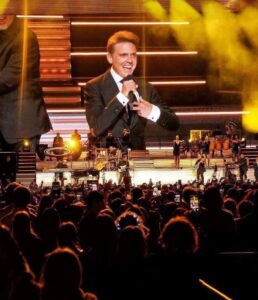 Por detrás de una big-band que comenzó a sonar ni bien se apagaron las luces del estadio, una pantalla horizontal proyectaba un resumen del camino de Luismi: desde pequeñísimo, cuando con su juvenil melena al viento asomaba como El Sol de México, allentado y condicionado por el infame Luis Rey, hasta imágenes más actuales en las que ya adulto y acompañado de mariachis, decidió rendirle tributo al país que lo acogió. Un crecimiento en público casi siempre marcado por el éxito, pero también por cruzado el dolor y la pérdida, especialmente la de su mamá Marcela Basteri.