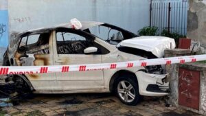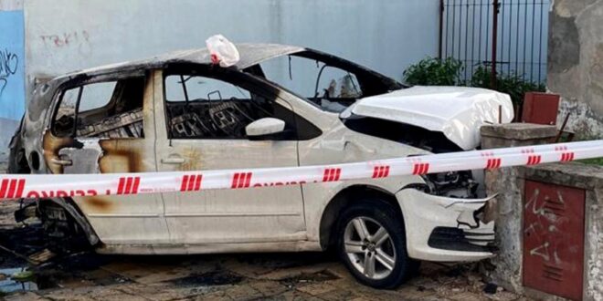 En tanto, el conductor volvió a subir al rodado y escapó, por lo que la policía comenzó la búsqueda y halló en el cruce de las calles Moreno y 9 de Julio el vehículo incendiado y chocado contra el pilar de material de una casa.