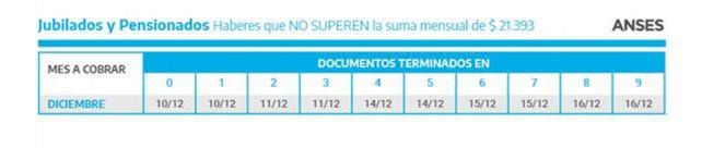 Durante diciembre, el calendario de pago a jubilados y pensionados se dividirá en dos: la primera tanda —los que perciben menos de $21.393— cobrarán desde el jueves 10 hasta el miércoles 20 de noviembre. A partir del jueves 17 cobrará el resto de los beneficiarios.