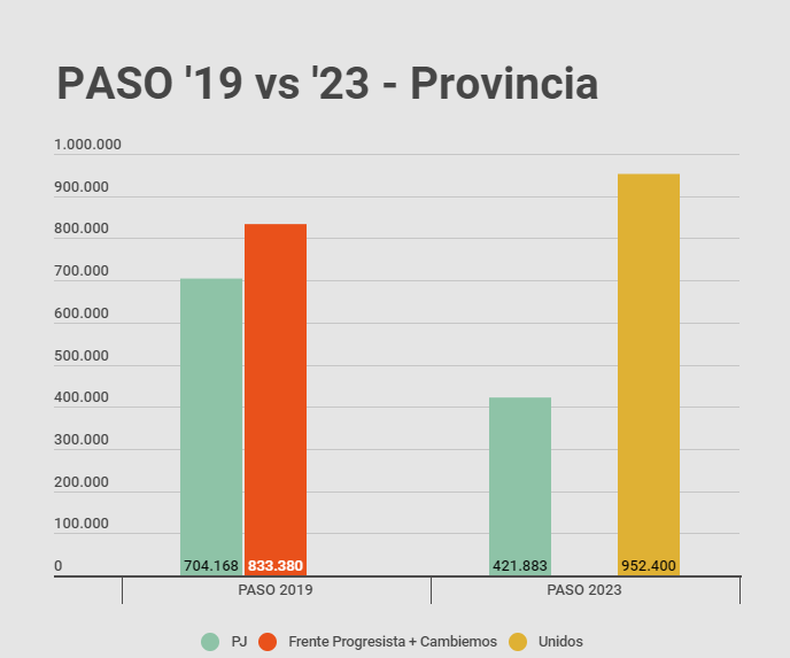 Incluso Unidos sacó más votos en una elección en la que se emitieron 136.000 votos válidos menos, 1.764.860 en 2019 contra 1.628.700 en 2023. El peronismo perdió 280.000 con menos votos emitidos, lo que abre la siguiente pregunta: los que no fueron a votar, ¿elegirán al PJ en las generales? ¿En qué volumen? El PJ podría apelar a esos que no fueron a las urnas, aunque deberá pescar mucho más en Unidos.
