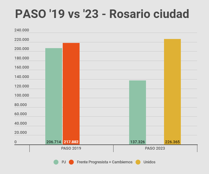 En las primarias anteriores, en el departamento Rosario Cambiemos (115.301) y Frente Progresista (166.277) sumaron 281.578, mientras que en la ciudad de Rosario la suma de la fórmula de José Corral (94.328) y de Antonio Bonfatti (123.554) registró 217.882. En las PASO 2023 Unidos creció, no mucho: en el departamento Rosario entre Pullaro (123.157), Losada (106.844) y Fein (65.519) lograron 295.520, unos 14 mil votos más, y en la ciudad 226.365 entre Pullaro (90.480), Losada (84.089) y Fein (51.796), casi diez mil más.