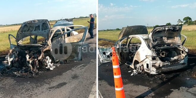 El hecho movilizó a los Bomberos Voluntarios de Angélica, quienes llegaron al lugar para sofocar el fuego que había envuelto por completo al automóvil, extendiéndose también a la banquina de la ruta.