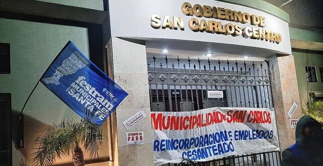 Luego de un conflicto por tres empleados cesanteados, trabajadores municipales de San Carlos Centro decidieron manifestarse frente a la Municipalidad . El reclamos es acompañado por la Federación de Trabajadores Municipales (Festram). La medida afecta a todas las dependencias públicas del municipio.