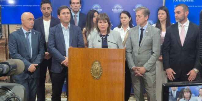 Bullrich brindó una conferencia de prensa acompañada por senadores de su bloque y referentes de la oposición dialoguista, como Eduardo Vischi (UCR) y Martín Goerling Lara (PRO).