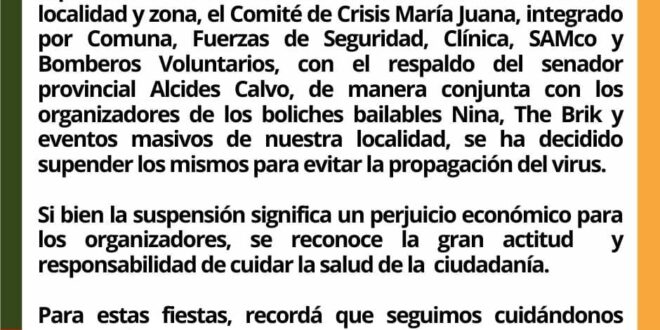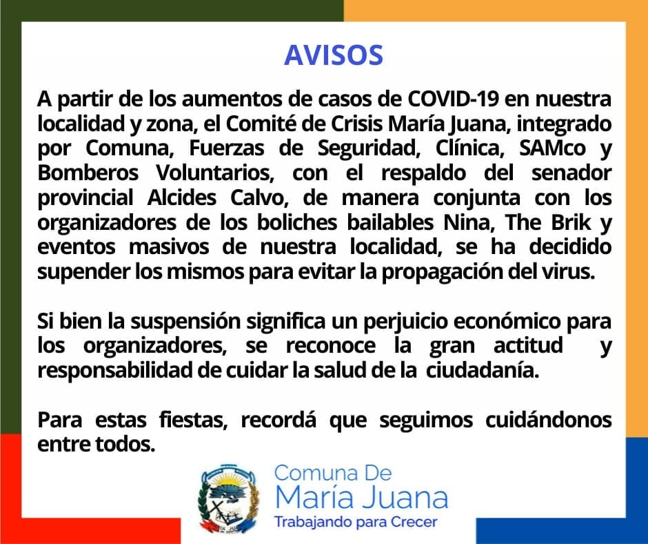 sí lo dispuso el Comité de Emergencia local, tras el rebrote de casos de Covid-19 en la última semana. Hasta el 16 de enero se suspenden boliches y fiestas bailables. En tanto, bares y restaurantes funcionarán con aforos y protocolos sanitarios.
