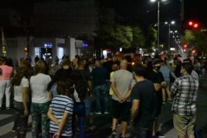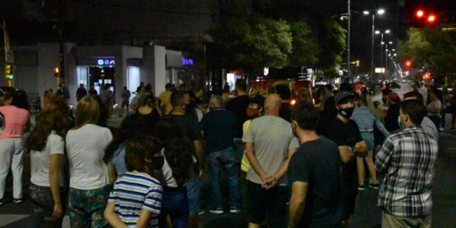 Una importante cantidad de referentes del sector de San Lorenzo y localidades aledañas se concentraron esta noche en la tradicional esquina céntrica para reclamar por la reapertura de los horarios laborales tras las restricciones anunciadas ayer por el gobernador.