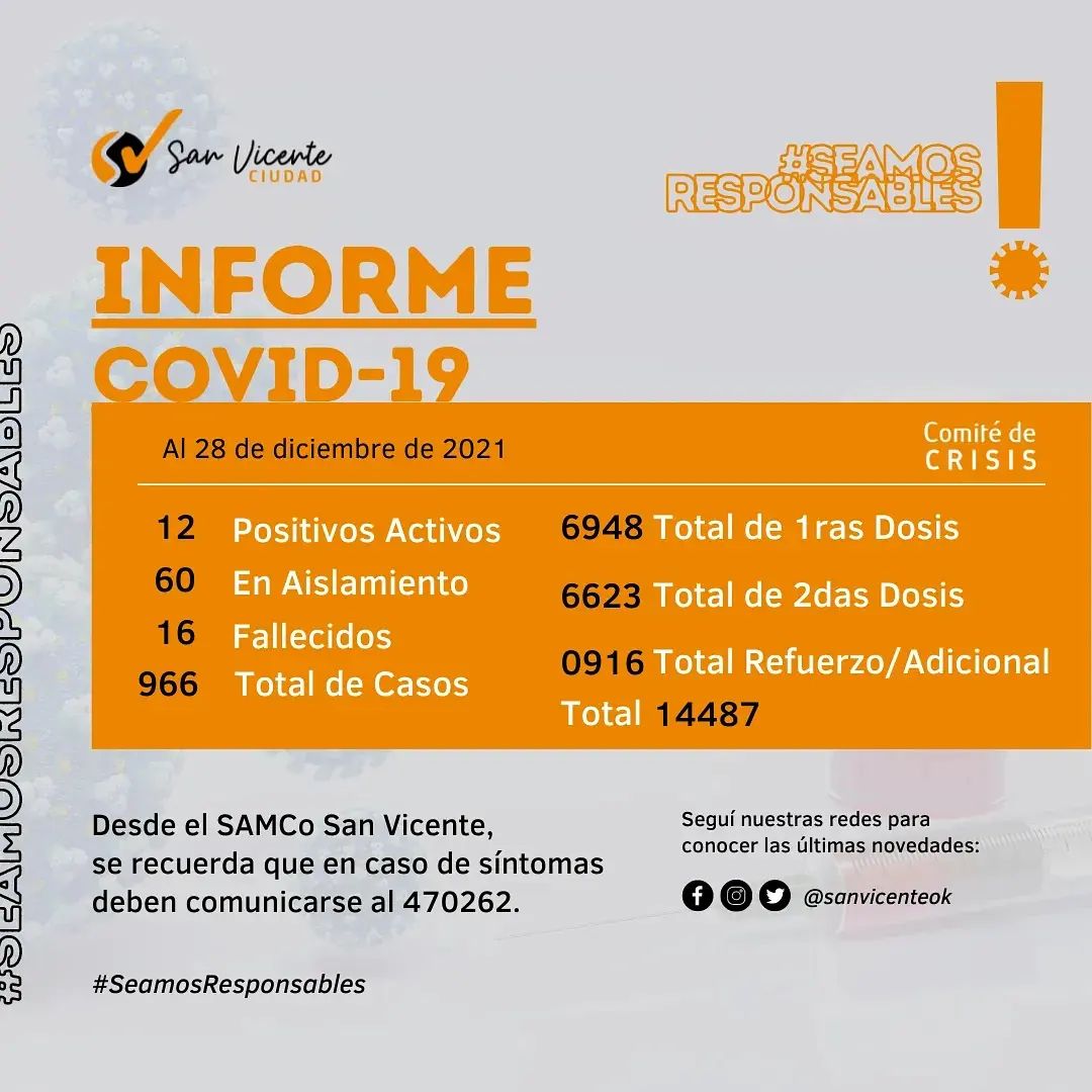 El #SAMCoSanVicente apela a la responsabilidad de cada uno de los ciudadanos y solicita a todas aquellos que presenten síntomas leves de resfrío o compatibles con #COVID19, evitar reuniones sociales y familiares. Comunicarse urgente al 470262.