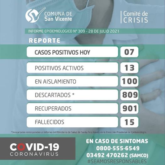 Informamos 7 nuevos casos positivos, los cuales hoy suman 13 positivos activos en total, debido a que 1 persona se ha recuperado y recibió el alta.