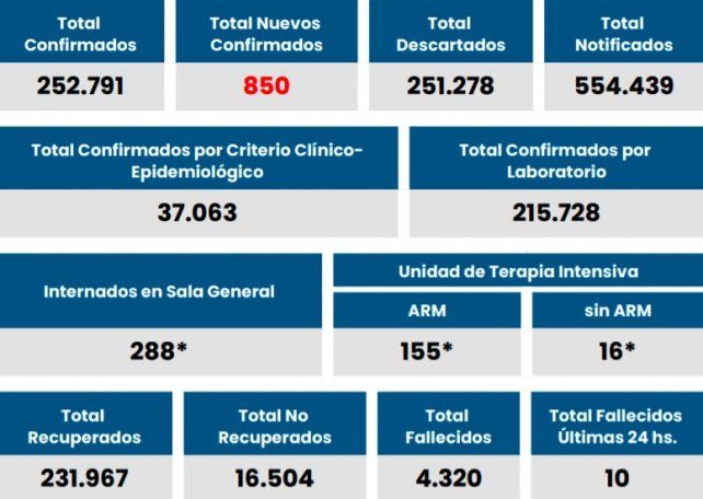 En cuanto al total de 252.791 contagios de coronavirus positivos, 215.728 fueron confirmados por laboratorio y 37.063 por criterio clínico-epidemiológico.