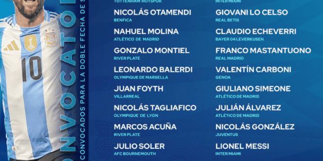 Con Lionel Messi (Inter Miami) como líder, la nómina incluye a figuras consolidadas como Emiliano Martínez (Aston Villa), Cristian Romero (Tottenham), y Lautaro Martínez (Inter de Milán), junto a promesas como Franco Mastantuono (River Plate) y Thiago Almada (Atlético de Madrid).