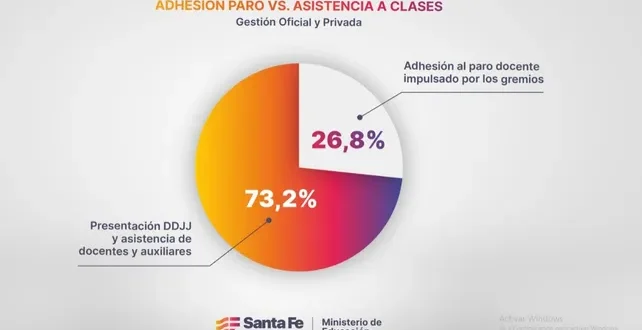 Figueroa afirmó que “60.962 docentes de toda la provincia estuvieron en su lugar de trabajo y completaron la declaración jurada que da cuenta que prestaron servicio”De un universo total de 83.213 representa el 73,2% de no adhesión a la medida de fuerza, y un 26,8% de adhesión.