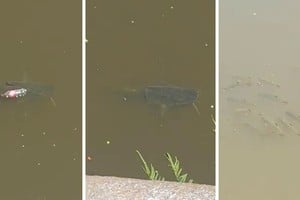 Junto al surubí, también se puede apreciar un cardumen de sábalos que nadaba en cercanías a las escaleras que servían para llegar al muelle flotante del catamarán turístico.