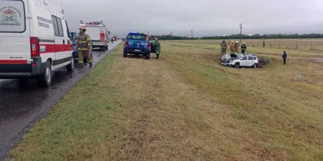 En el lugar, varios equipos de rescate y autoridades trabajan en la escena, incluyendo personal de Bomberos de Sunchales, Corredores Viales, Gendarmería Nacional y oficiales de las comisarías de Sunchales y Tacural.