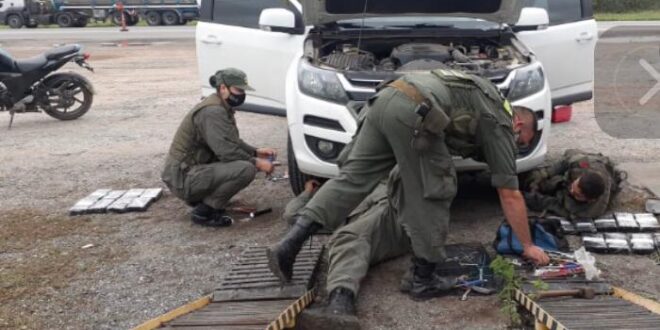 Encontraron “paquetes” en el techo (entre la lona y la chapa), en la zona de la rueda y en el motor. En total, 24 ladrillos, que pesaban más de 25 kilos. El narcotest dio positivo para cocaína.