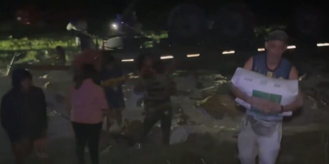 Al costado de la ruta, una escena dantesca: el camión volcado en la banquina, bolsas enteras desparramadas y otras apiladas, harina suelta y niños jugando a hacer montañas blancas, hombres con las bolsas de 25 kilos al hombro, todo en plena oscuridad de la ruta llena de conos anaranjados, alumbrados por las cámaras de El Tres.